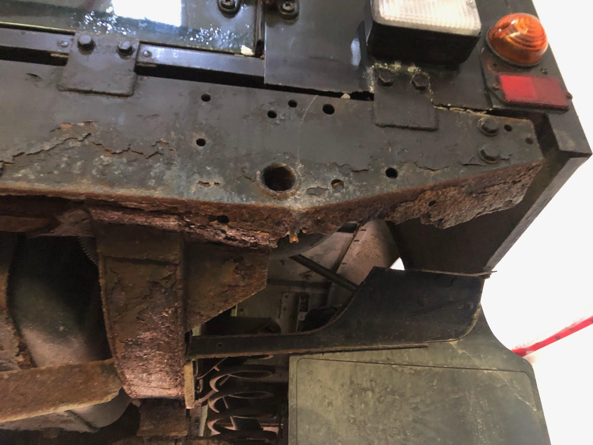 This vehicle is very tight and drives exceptionally well. It has significant corrosion on the rear frame and crossmember. It will require most if not all bushings to be replaced as well a new windscreen, as there is crack in front of the driver. It will need at least new swivel seals and likely some brake line replacement.
